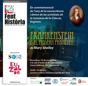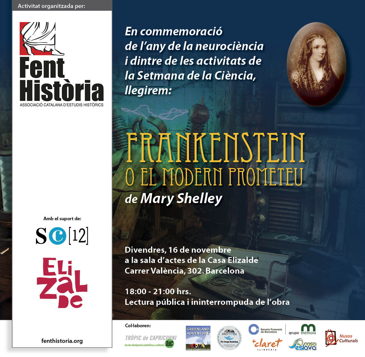 Amb motiu de la Setmana de la Ciència (enguany dedicat a l’any de la Neurociència), Fent Història amb el suport de Casa Elizalde, ha organitzat una lectura pública i ininterrompuda de “Frankenstein o el modern Prometeu” de Mary Shelley. Serà divendres de 18:00 a 21:00 hores a la sala d’actes de Casa Elizalde (C/ València, 302, Barcelona).