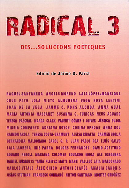 Aquí es recullen mig centenar de poetes, la majoria en català i castellà, que han participat durant l’última temporada de Radical 3, mitjançant lectures presencialss, i des que ens va afectar la pandèmia, tambè digitals. Es presenten dos poemes per autor, inèdits o no publicats i una succinta biobibliografia de cada poeta. En marcar el títol ‘Radical 3’ en vermell a la portada, amb la lletra ferida i desvirtuada, es pretén també defensar una poètica dissolutiva, barreja de caos i de creació. Dis…solució: trencar amb la solució i el dirigisme; afrontar la incertesa del mateix caos creatiu.