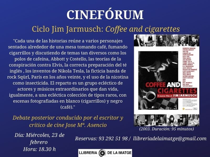 🎥 Dimecres, dia 23 a les 18.30, continuem amb el cicle Jim Jarmusch, aquest cop amb la projecció de la pel·lícula “Coffee and cigarettes”. A càrrec de José María Asencio.