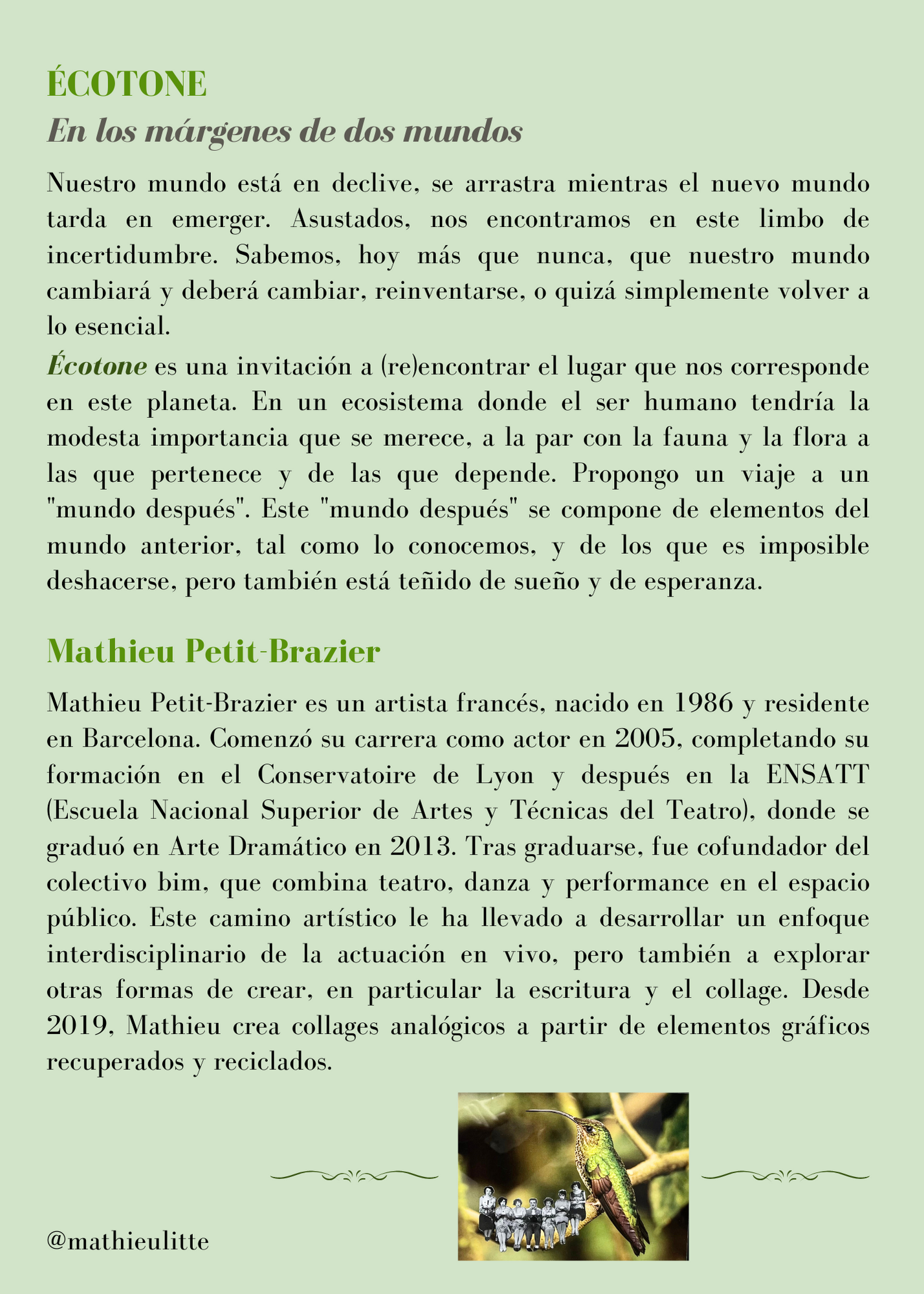 Inauguració Exposició On Novembre 8, 2023Novembre 13, 2023 Per llibreriadelaimatgeIn EXPOSICIONS, SERVEIS Divendres inaugurem “ÉCOTONE, en los márgenes de dos mundos”, de l’artista francès @mathieulittle .Obres de collage analògic que reconcilien la Natura amb la Humanitat. Comparteix això: Feu clic per compartir a X (S'obre en una nova finestra) X Feu clic per compartir al Facebook (S'obre en una nova finestra) Facebook M'agrada S'està carregant... Relacionats
